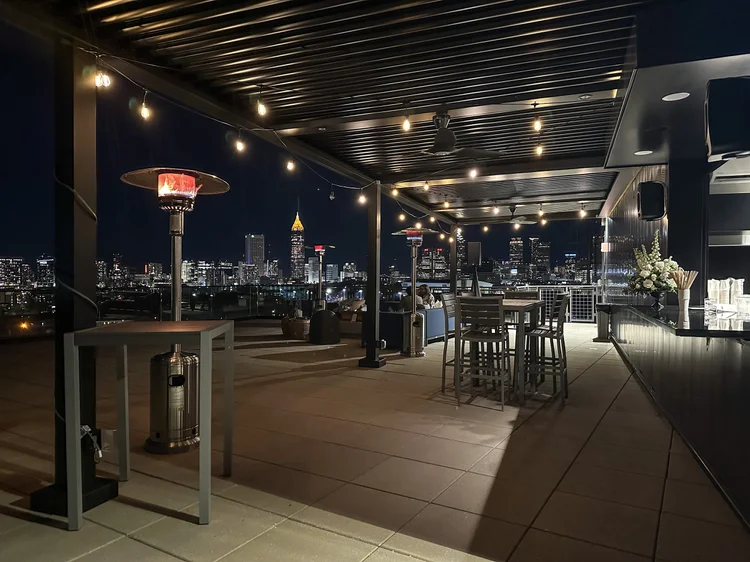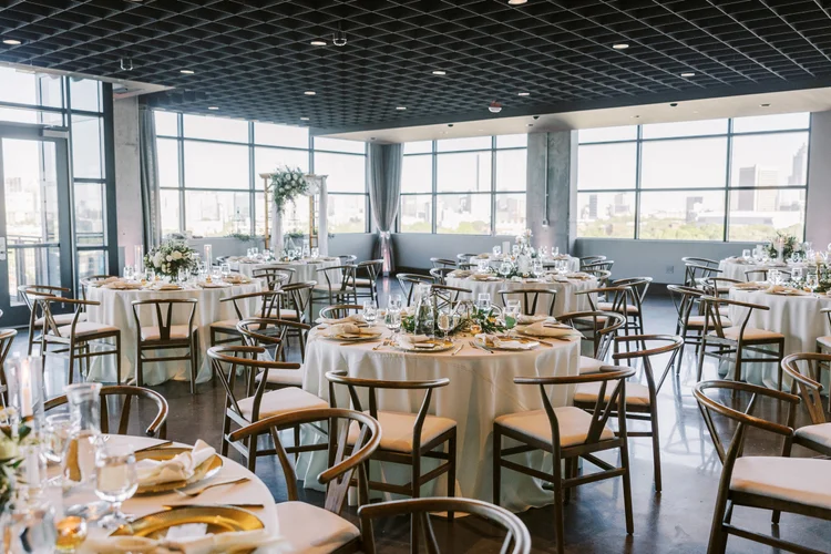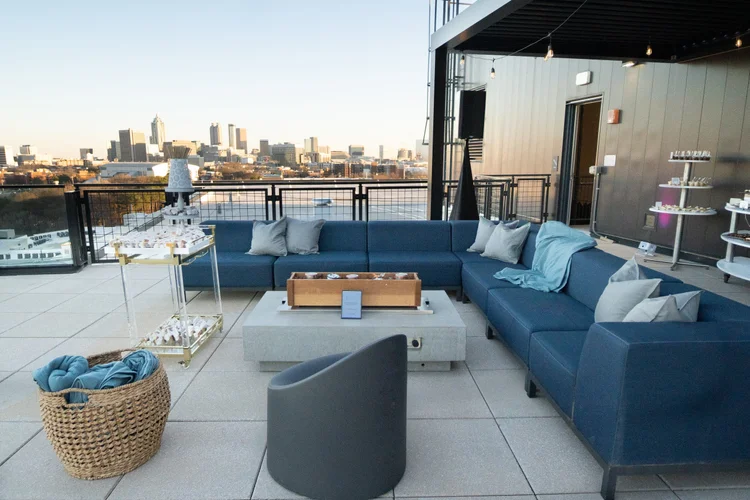 Summit is a modern event space & rooftop venue located on the 8th Floor of the 8West building in the buzzy West Midtown neighborhood. This modern event and wedding venue overlooks Midtown Atlanta, Georgia Tech, Mercedez Benz stadium, and Downtown. The warm wood and dark hues of the design frame the unparalleled views from the front door throughout the entire venue. Coupled with the rooftop rental option, Summit at 8West provides a truly memorable location for every occasion